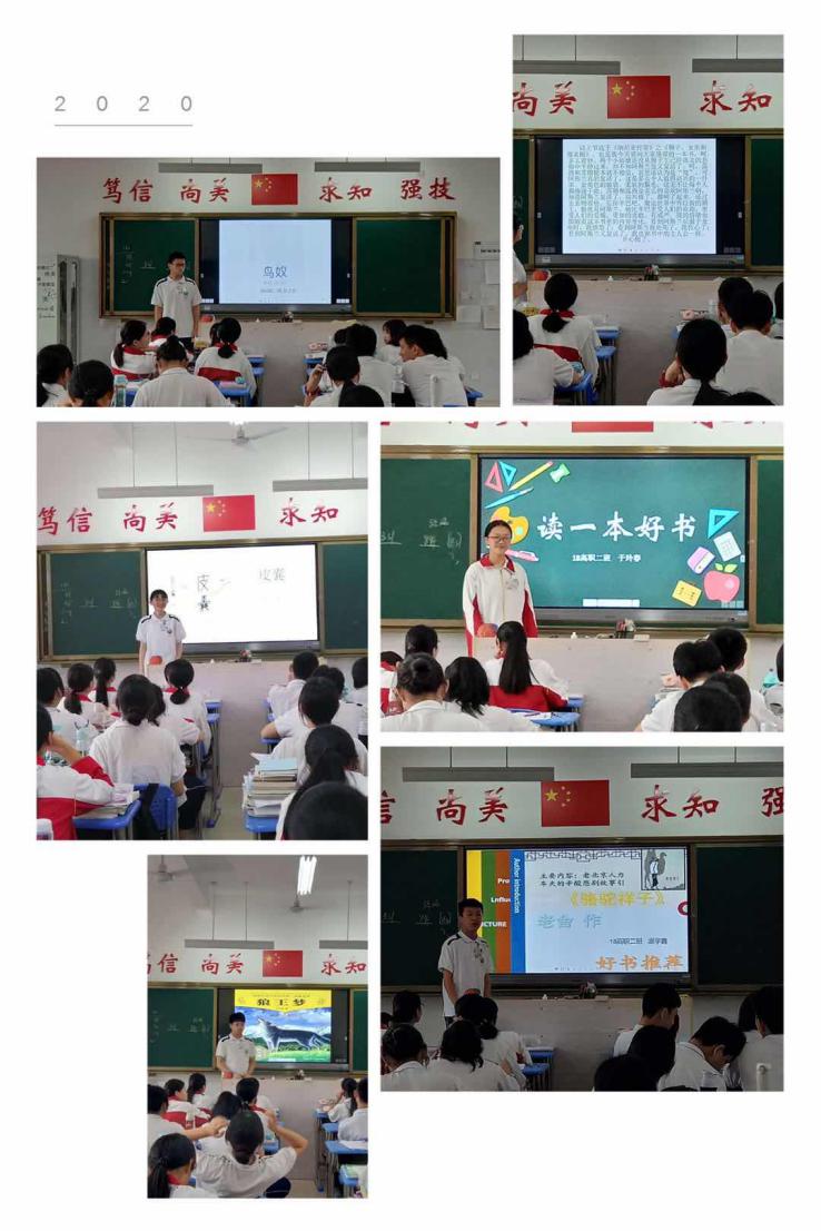 活动中,同学们打开制作精美的PPT,从作者介绍、内容简介、读后感等方面,绘声绘色地介绍自己2020年春节以来读到的最喜欢或印象深刻的好书。在分享者的积极畅言中,同学们从《狼王梦》中了解到迎难而上的重要;从《简爱》中领会爱的平等和自尊自重;从《战争与和平》中看到人们对正义的追求、自由生活的向往……