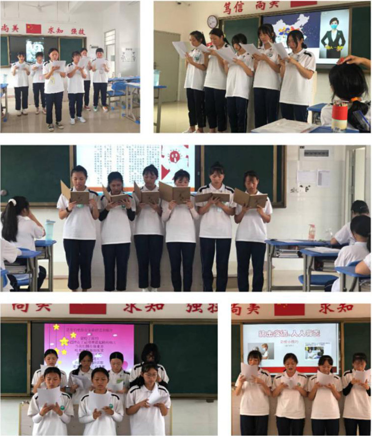 活动由李双慧、黄榕鑫同学主持。同学们以精美的PPT为背景,根据诵读内容的不同,赋以各具特色的声调和情感,有的激情澎湃,有的高亢激昂,有的低沉浑厚。《致敬新英雄》《那些英雄的事迹》《疫去春来》《众志成城抗击疫情》《人民战“疫”》……不同的内容,相同的主题,同样的共鸣,一首首感人至深的赞歌“回放”着全国人民齐心抗疫的动人画面,师生如临其境、情动入怀。
