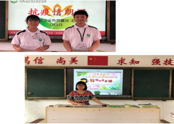 夏日是那样多姿多彩,又是那样热情奔放,但一切都不及我们重逢的喜悦。为了弘扬万众一心、同舟共济的抗疫精神,坚定文化自信,建设书香校园,2020年7月1日下午班会课,18美妆(金色芭蕾)在班主任范小妹老师的组织下,开展了抗疫情诵读活动。